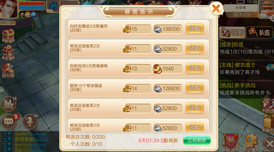 说明:帮派悬赏任务开启,悬赏任务数量有限,根据帮会等级有增减。小伙伴要积极领取,都是先到先得的任务哦。