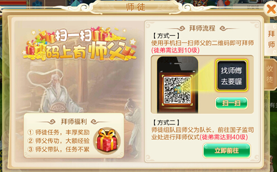 说明:想要成为师徒的仙友可进行组队前往(2人组队)师徒(国子监司业)处点击“进行拜师仪式”,直接拜师需要仙友达到40级或以上才能成为徒弟,如果用“扫一扫”拜师则依然是10级以上就可成为徒弟。