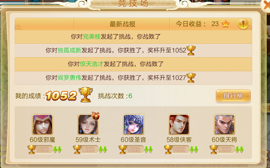 说明:竞技场奖杯计算和难度判定重新调整,这会影响到排行榜的排名,等级高的仙友对奖杯的影响会比之前的影响更大,并且要注意每次的对手哦,对手有挑战礼包等你来拿。