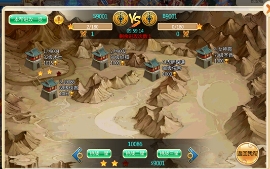 每周二、周五12:00进入准备时间,14:00正式开始,可以选择对对面玩家进行挑战,挑战时可以选择1星、2星或者3星难度,星星越多难度越大,一旦被3星攻破,则该玩家不能再次被挑战。每个玩家只有2次机会进行挑战。直到24点活动结束,总星数高的帮派获胜,胜利的帮派将获得大量的帮派资金。
