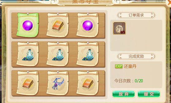 根据黑市订单要求完成指定任务,将获得订单奖励,没完成一个订单,10分钟生成新的订单、订单可放弃,放弃之后30分钟生成新的订单。每天可完成次数为20次。