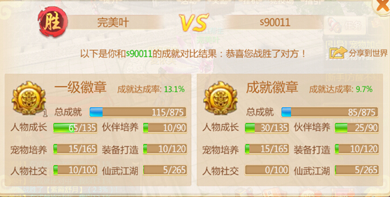 玩法说明:点击玩家头像—成就对比,就能与其他玩法对比成就的获得情况了,还能分享到世界聊天频道哦。