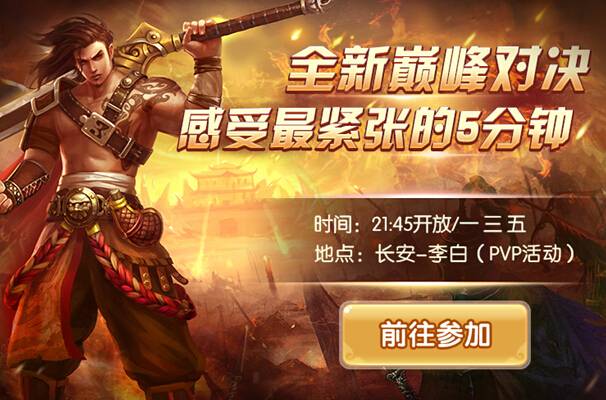 巅峰对决已经从1v1,摇身一变成3v3的战场对决。在巅峰对决中,仙友们不可以携带宠物,用真正的个人实力进行战斗。战场随机出现,地形不同打法各异,并且战场中拥有宝箱,打开后会获得正面效果或对方负面效果,对战场会产生胜负影响哦!