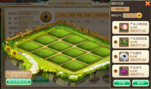 帮派庄园可进行任意种类的种植,种植时间进行缩短调整,并且增加了灵气种植。在操作上也更便捷,前往其他庄园的话需要点击左下角的按钮进行,不要找不到哦!