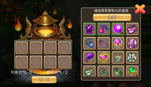 背包中增加炼丹炉功能,仙友可以打开自己的背包点击炼化,打开此界面,可对背包中的物品进行批量炼化,减轻小伙伴对道具炼化反复操作的痛苦。