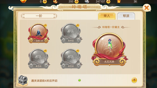 a.单人模式玲珑塔每5级开启1层,包括4个普通关卡和1个霸主关卡